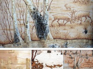 樺樹皮畫是樺樹皮工藝品中重要一種,它從簡單適用的生活必需品中脫穎而出,成為滿族鄂倫春、鄂溫克、達(dá)斡爾、赫哲等北方狩獵民族精神文化特殊需求的用品。樺樹皮畫是用樺樹皮為繪畫材料,運(yùn)用樺樹皮天然形成的紋理、樹節(jié)為繪畫元素,利用獨(dú)特的繪畫工藝和技術(shù)繪制的以反映游獵民族社會(huì)生活為內(nèi)容,體現(xiàn)游獵民族思鄉(xiāng)情懷的工藝美術(shù)品。樺樹皮畫主要使用揭皮手法和碳化工藝來進(jìn)行創(chuàng)作,崇尚自然和環(huán)保理念。自然古樸、不可復(fù)制、裝飾性強(qiáng)和游獵民族的民族特性,是樺樹皮畫的幾個(gè)突出特點(diǎn)。