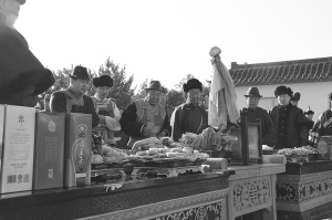 白酒、點(diǎn)心、干果,長長的條案上,擺放著各式祭品