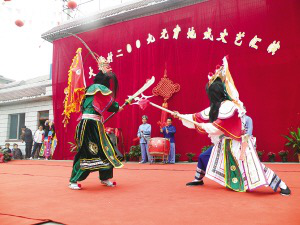 對(duì)漢民族所崇拜的英雄豪杰、尚武精神,大寨村的布依族祖先沒(méi)有排斥,在保持自己民族習(xí)慣的同時(shí)大膽接受。也許,在他們心中,具有儺戲性質(zhì)的地戲可以驅(qū)除不良習(xí)氣。