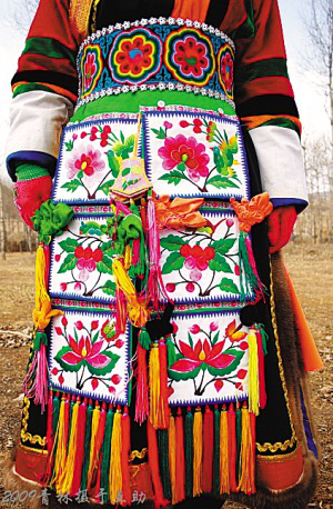 2009年冬季的農(nóng)歷二月二,喜歡繪畫的我第一次到青海省互助土族自治縣拍攝土族服飾?;ブ磷迮缘姆椬屛易罡信d趣,感覺是到了春季雨后的彩虹間,那樣絢麗多彩而又細膩動人。土族女性服飾的袖子用紅、黃、黑、綠、白等不同顏色拼成,恰似天上彩虹,因此,互助被譽為“彩虹的故鄉(xiāng)”。在互助流傳著這樣一首民諺,土族阿姑(未婚女性)穿上彩虹袖,“走起路來擺三擺,蜜蜂彩蝶趕不走;拂袖跳起安召舞,恰似彩虹下凡來?!边@無疑是對彩虹袖最詩意的詠嘆和贊美。