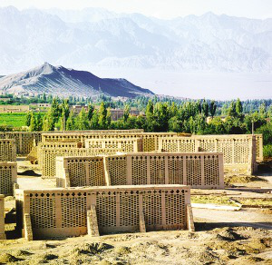 吐魯番曬葡萄干的“陰房”。這里處于我國海拔最低的盆地,也是維吾爾族聚居區(qū),冬冷夏熱,民居既要防寒又要防暑。吐魯番盛產(chǎn)葡萄,每戶皆有曬葡萄干的陰房,因此,住房與陰房合一的民居成了吐魯番的特色。大的陰房都集中建在山坡上,以利運(yùn)輸,小的陰房
