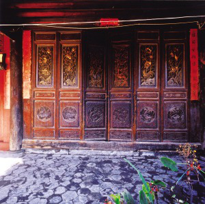 云南大理市綠桃村“三坊一照壁”民居堂屋六扇木門的雕刻。院內(nèi)廈廊和正房的格子門,一般由6扇組成,每扇門又分隔成5塊木板,每塊木板都是透雕和浮雕相結(jié)合的木雕。分別雕刻著“雙鳳朝陽(yáng)、二龍搶寶、八仙過(guò)海、喜鵲登梅、漁樵耕讀、六合同春”的吉祥圖案,刀法嫻熟,輪廓清晰,形象生動(dòng),一個(gè)院落就是一個(gè)木雕藝術(shù)畫廊。此外,窗上有通透的花格,下部檻墻做成木質(zhì)裙板。