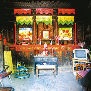 隴川縣戶撒鄉(xiāng)曼旦寨是阿昌族古老的村寨之一,明、清時(shí)期的老宅皆以楠木建造,數(shù)百年不朽、無蟲蛀。受漢族文化影響,傳統(tǒng)民居大都是土木石結(jié)構(gòu)的三合一照壁或四合院落。正房建在長方石條加土方壘起的屋基上,屋基下為院壩,以三層石階上下。正房三開間,四排五柱,中柱起脊,形成雙斜面屋頂,上覆凹型青瓦。后墻和兩側(cè)山墻以土坯砌筑,外面不抹泥,左右是廂房或照壁。室內(nèi)隔墻均為木板,中間一間為堂屋,有一米多寬的吞口,六扇雕刻的木板門,平時(shí)只開中間兩扇。兩邊的檐柱頭有粗獷的木雕。吞口有走廊的作用,一般左側(cè)角設(shè)臉盆架以供洗漱,板壁上掛小鏡框以便梳妝,旁邊掛著家人的照片。有的擺著縫紉機(jī),有的放藤椅小憩。右側(cè)放臨時(shí)的農(nóng)具,掛衣服,板壁上貼著影視明星的招貼畫。堂屋正面板壁是通高的木雕佛龕,供奉佛像和傣文的經(jīng)文,龕楣上貼著三至四層掛錢,下面有燭臺(tái)、香爐。左側(cè)擺著電視機(jī)、熱水瓶、茶桌,板壁上掛著戶撒刀和手工編織的背兜,右側(cè)有專供老人休息的床或藤椅,也有的砌火塘,火塘的小土臺(tái)上放著炒菜的調(diào)料、火柴和照明燈具。