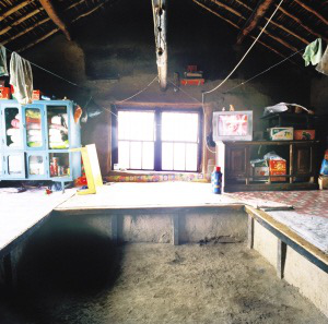 達斡爾族住房以兩間或三間居多,以西屋為上,不設北窗。東西兩屋的南面各有3扇窗戶,中間一間在房門兩側各有一扇窗戶,西屋開兩扇西窗,更利于采光和通風,這在北方民居中比較少見。兩間房的西屋是起居室,南、西、北三面連炕,成“凹”字形,與滿族的“萬字炕”差不多。近些年,達斡爾族家庭人口少了,特別是結婚的新房只搭北炕,南面放置組合家具和冰箱、洗衣機。東屋開南門,作為廚房,砌鍋灶,一般用8印或10印的鐵鍋。煙囪在墻外,與房頂有距離,有的用草垡子壘砌,有的用木板,這樣的煙囪不僅抽力大,灶堂好燒,而且可以避免草房頂?shù)幕馂?。近十幾年建的房子,煙囪都在西山墻上用磚壘砌,一直伸出屋脊后坡,高出房頂一米多。