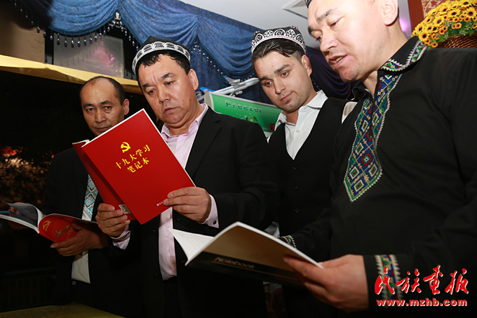 新疆美食城店主阿地力·買(mǎi)買(mǎi)提帶領(lǐng)維吾爾、哈薩克、回族等員工學(xué)習(xí)十九大報(bào)告