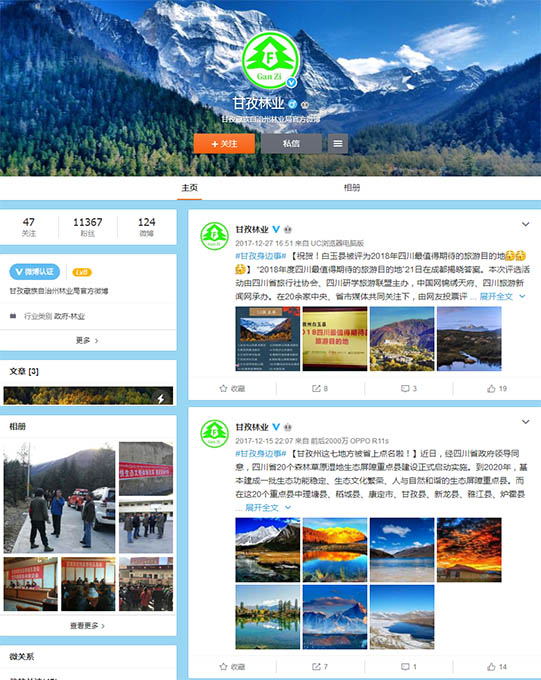 近年來甘孜林業(yè)積極拓展“內(nèi)宣+外宣”“兩條腿走路”的新媒體運(yùn)營模式。一方面通過甘孜林業(yè)無線站點和微信平臺向州內(nèi)群眾宣傳黨的惠民政策、普及林業(yè)方面知識、展現(xiàn)甘孜林業(yè)人精神風(fēng)貌;另一方面通過甘孜林業(yè)頭條號和微博進(jìn)行外宣,吸引更多熱愛甘孜的人到甘孜投資創(chuàng)業(yè)和旅游觀光。