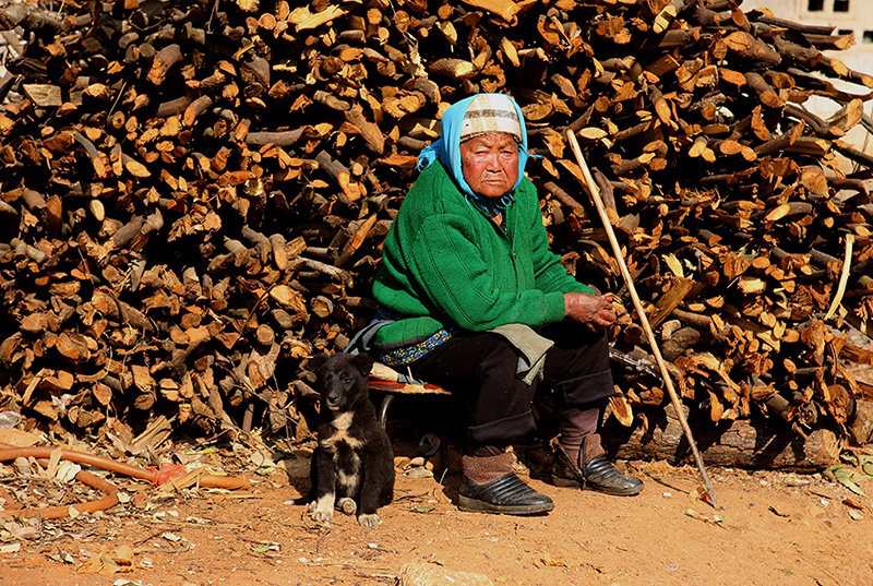 2月初的丘北,連日陰雨,是一年中最冷的時(shí)節(jié)。我先于拍攝團(tuán)隊(duì)幾天到了村里,想獨(dú)自在這里轉(zhuǎn)轉(zhuǎn),熟悉一下村民,篩選一下拍攝的人物。正當(dāng)我在一個(gè)泥濘的岔路口徘徊,尋思著是否要問(wèn)路去村主任家的時(shí)候,旁邊屋子里走出一個(gè)人,面容親善:“天好冷啊,進(jìn)來(lái)烤烤火吧!”他打招呼的方式如同熟人,一笑時(shí)露出兩排又白又整齊的牙齒。于是,他家擁擠的火塘邊又多了一個(gè)人。大家圍著火爐有一搭沒(méi)一搭地聊天,語(yǔ)調(diào)溫和小聲,沒(méi)話(huà)的時(shí)候大家也不覺(jué)得別扭,只聽(tīng)見(jiàn)玉米骨在火塘里噼啪作響。這是一個(gè)五代同堂的大家庭,招呼我的主人楊樹(shù)紅和妻子以及祖母、父母一起生活,兒子和女兒在廣東打工,已經(jīng)回村準(zhǔn)備過(guò)節(jié),兒子未婚,女兒則有了兩歲的孩子。楊樹(shù)紅的祖母出生于1922年,是這個(gè)村子里最老的老人,耳朵有些背。我大聲問(wèn)她是否還記得年輕時(shí)候踩花山,她拍著我的手背說(shuō):“17歲我就去踩花山嘎!好玩嘎!”兒媳笑著解釋說(shuō):“估計(jì)她說(shuō)的是17歲踩花山的時(shí)候碰到爺爺,被他拖媳婦拖走的事呢?!弊婺改昙o(jì)太大,看著她手上和臉上深深的褶皺,不知藏了多少往事。