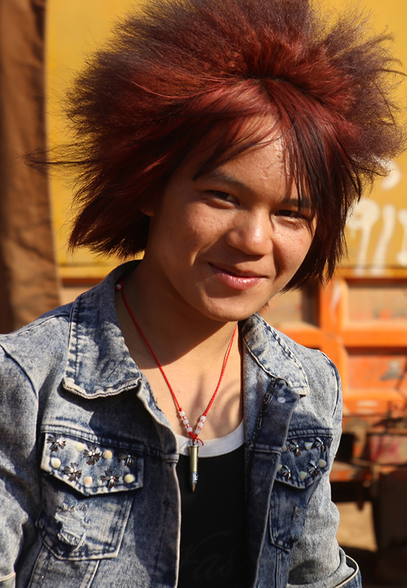 與女性不一樣,這里的男性不講究穿苗服。大多數(shù)苗族年輕男子如今都在城里打工,他們更愿意展現(xiàn)自己個(gè)性時(shí)髦的一面,印有外文字母的休閑衣服受到格外的歡迎。新潮的西服皮鞋,嬉皮的休閑牛仔,紋身,墨鏡,耳釘,項(xiàng)鏈……我發(fā)現(xiàn)幾乎所有的年輕男子都會(huì)在自己的頭發(fā)上做點(diǎn)文章,而今年的潮流似乎偏向夸張的美感。