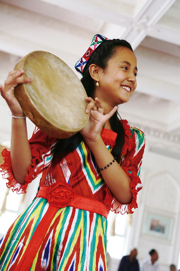 11歲的麥迪娜是小學(xué)五年級(jí)的副班長(zhǎng),在麥蓋提一小雙語(yǔ)班讀書,漢語(yǔ)好到可以給我做翻譯,向老藝人提問(wèn)。麥迪娜的世界已經(jīng)和老藝人、和叢林中艱難漁獵的祖先不一樣了。她在麥西來(lái)甫中敲達(dá)甫手鼓,在活動(dòng)中心學(xué)習(xí)電子琴,是女子“手鼓樂(lè)隊(duì)組合”中8位11—3歲女孩子中的一個(gè)。她希望將來(lái)能在北京上學(xué)、成為醫(yī)生治好奶奶的糖尿病。她會(huì)用漢語(yǔ)唱國(guó)歌和《歌聲與微笑》,還有《茉莉花》,雖然吐字與調(diào)子不太那么準(zhǔn)。她圍著阿布都克萊姆(被稱作“維吾爾人的趙本山”的維吾爾族諧星)索要簽名的同時(shí),還喜歡羅志祥,以韓國(guó)偶像組合EXO為榜樣。麥迪娜還上過(guò)電視,常有喀什地區(qū)的、自治區(qū)的、全國(guó)的媒體到麥蓋提來(lái)采訪、錄制刀郎麥西來(lái)甫。