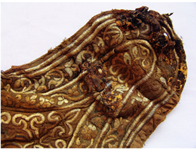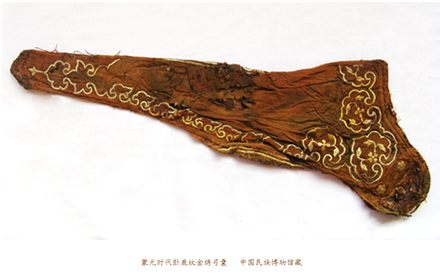我們曾經(jīng)描述過元代納石失生產(chǎn)的空前絕后。蒙古民族把對于黃金的寶愛,傾泄進元朝一百年的歷史時空。在整個13世紀(jì)的每一個歷史篇章,都鐫刻著納石失的金縷光影。我們在史料里看到,天子之衣是納石失,天子之裳是納石失,天子之履依然是納石失。那么,蒙元一代,還有什么是用黃金絲線耗盡心血織繡而成的呢?現(xiàn)在,我們看到了這只金繡弓囊。