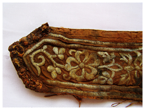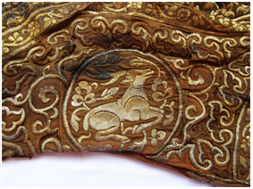 中國民族博物館館藏的臥鹿紋金繡弓囊通長72CM,最寬處25CM,最窄處6.5CM。面料為絹地,呈深褐色。專家推斷其入土前應(yīng)內(nèi)襯樺樹皮或獸皮類框架。弓囊正面以銀裹金錢繡滿圖案,整體金碧輝煌。由于埋藏地下數(shù)百年,弓囊兩端的鐵質(zhì)穿環(huán)和皮條已銹蝕腐爛。