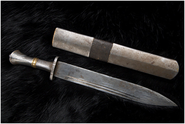 地處藏東的林芝地區(qū)一帶,也叫貢布地區(qū),居住著藏族、門巴族和珞巴族,這里山高林密,野獸出沒其間,靠山吃山,人們伐薪狩獵是家常便飯。所以人們使用的刀具以寬、長為多。刀鞘多為木質(zhì),外面用獸皮包裹,一般是用野獸腿骨上的皮,有些還帶有爪子。外在裝飾主要是附在獸皮上的毛色和趾爪。其用途除了捕獵格斗,更是人們在密林中劈荊斬棘的利器。