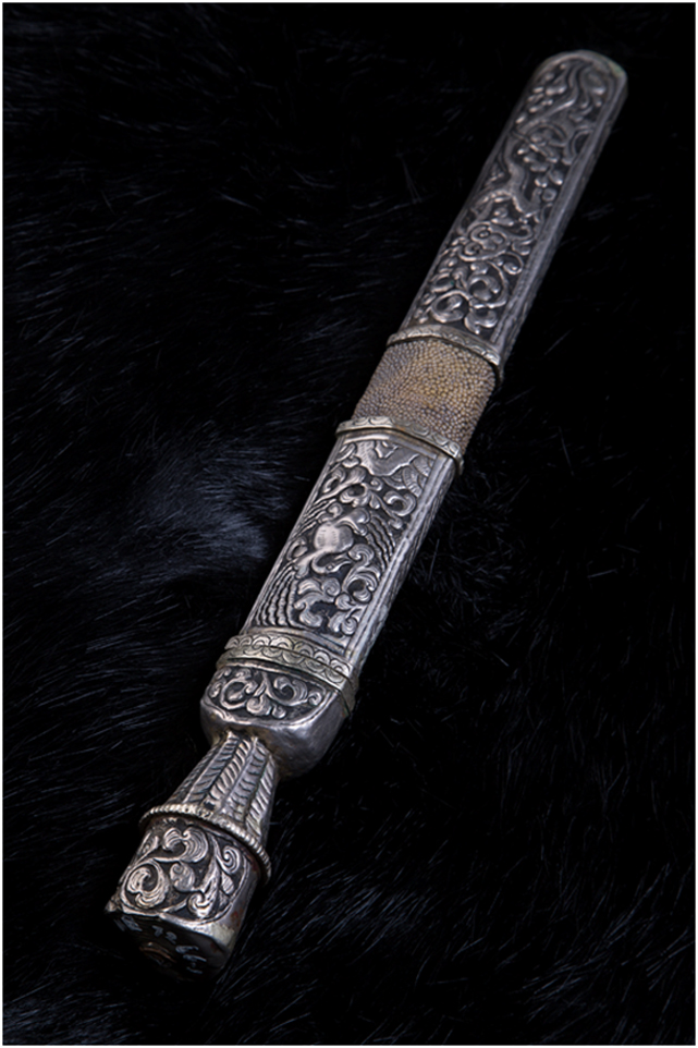 康區(qū)人性格粗獷豪放,刀對于他們來說,主要是戰(zhàn)斗的武器,他們愛刀勝過愛牛羊,一把好刀就是一筆財(cái)富,其形象也會(huì)因之而無形中高大起來。正因?yàn)槿绱耍麄儾粌H對刀本身有較高的要求,對其作為襯托武士氣概的刀的外在形制也有特殊的喜好。刀鞘材料一般使用黃、白銅或純銀,鑲珠嵌寶,正面雕龍畫鳳,背面線刻卷草,佩在身上,起到了美觀和威懾的雙重作用。