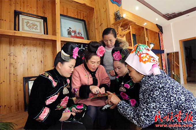 長裙苗刺繡國家級傳承人楊阿妮(左二)和繡娘們交流刺繡技法