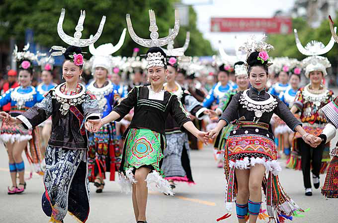 2017年4月28日,黔東南苗族侗族自治州丹寨縣盛大舉行“云上丹寨?遠(yuǎn)古霓裳”丹寨八大支系服飾巡游活動,來自全縣六個鄉(xiāng)鎮(zhèn)八大支系的2000余名苗族同胞身著節(jié)日盛裝,集聚在縣城錦雞廣場進(jìn)行服飾展演(黔東南苗族侗族自治州人民政府網(wǎng))