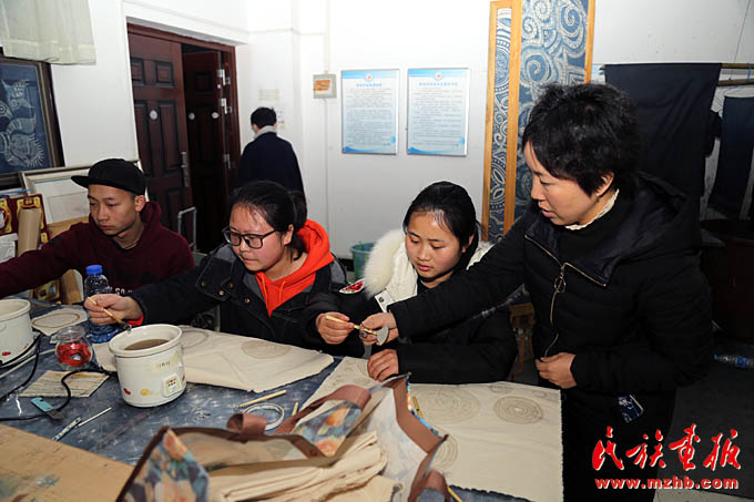 吳安麗老師(右一)在凱里學(xué)院藝術(shù)學(xué)院蠟染實訓(xùn)室指導(dǎo)學(xué)生