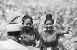 4月15日,潑水狂歡活動(dòng)在景洪市潑水廣場(chǎng)舉行。各族群眾用相互潑水的方式互送祝福、傳遞歡樂(lè)。