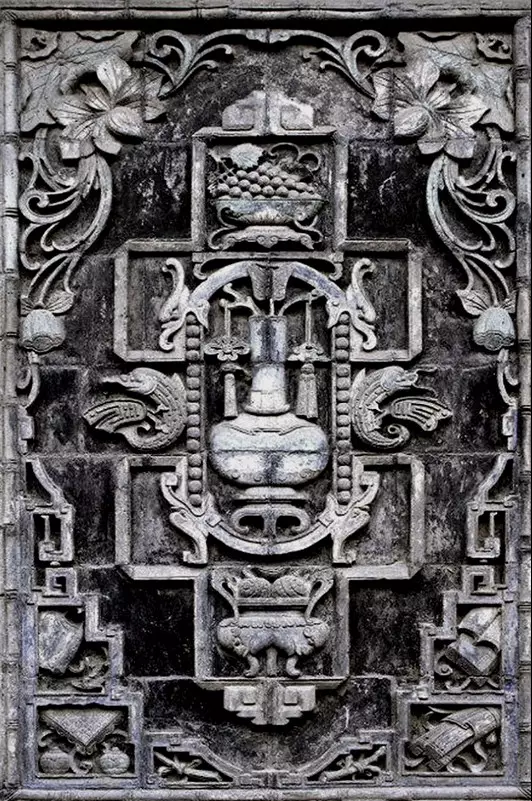 清代,北京紫禁城宮廷內(nèi)墻面夾柱的通氣孔也都使用磚雕,鏤雕花鳥圖案,牢固磚雕 而美觀,且利于空氣流通。