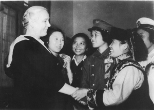 1955年9月蘇聯(lián)卓婭和舒拉的媽媽?zhuān)ㄗ笠唬┰L問(wèn)中國(guó)時(shí)接見(jiàn)中國(guó)的“瓦爾瓦娜”(蘇聯(lián)電影《鄉(xiāng)村女教師》女主角)、全國(guó)青年社會(huì)主義建設(shè)積極分子阿角(右一),時(shí)有郝建秀(左三)、徐建春(左二)同志在場(chǎng)。 資料圖片