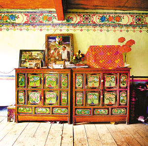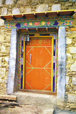 房屋大都是3層,上層存放干草和秸桿,下層關(guān)養(yǎng)牲畜,中間一層是居室。居室用木板隔間,里間較小是已婚子女住的,外間寬敞,是多功能堂屋。臨窗處設(shè)火塘,以利排煙,是家庭生活中心和待客之處?;鹛辽霞苤T大的鐵三角架,上面是六七厘米寬的鐵板圈,擦得錚亮,能烤制食物。墻角處供奉佛像,擺放領(lǐng)袖像。房門安設(shè)木鎖,用十幾厘米的木鑰匙開啟,都是由硬木刻制,光滑耐用。