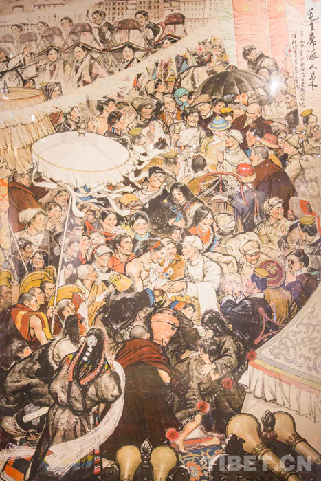 鑒賞展現(xiàn)場,不少前來參觀的畫家都是韓書力的學(xué)生或在一定時期曾受其教導(dǎo)?!?973年,我在西藏自治區(qū)展覽館見到了韓書力老師,第一次見面我就拜了師。我們一起下鄉(xiāng),我就給他當(dāng)導(dǎo)游和翻譯。30幾年來,我一直在學(xué)習(xí)韓老師的繪畫技法,到現(xiàn)在還是他的學(xué)生。韓老師創(chuàng)作《毛主席派人來》時,我就跟在旁邊學(xué)習(xí)。學(xué)到了一些創(chuàng)作獨幅作品的技巧和手法,讓我受用至今?!蔽鞑厍嗄戤嫾矣嬅莱嗔姓f。