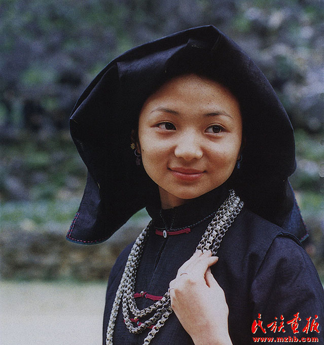 婦女的服飾更具特點(diǎn),無論老少,都喜歡穿右蓋大襟和葫蘆狀矮腳圓領(lǐng)的緊身短式上衣,下身以寬褲腳、大褲頭的褲子相搭配,腰系黑布做成的大圍裙,頭帶黑布大頭巾。其圍裙既寬且長(zhǎng),戴時(shí)能系周身有余,裙底垂掛到小腿下部,圍裙不僅作為裝飾,而且可以作為勞動(dòng)工具,遇趕圩或走親訪友和勞動(dòng)時(shí),可將圍裙底翻卷上來作成小包袱,用以包裝和盛裝物品。婦女頭巾都是一塊自己紡織染成的長(zhǎng)條黑布,戴時(shí)先圍繞在頭上,然后翻折擺布成火棱形的圖樣,罩在整個(gè)頭上,再把頭巾的兩端分別垂掛到雙肩上,看上去樸素美觀。同時(shí)還可以當(dāng)做帽子遮蔭用。她們的衣邊、衣角、袖口、裙邊和頭巾的四邊都用紅布或黃布剪成小條以后鑲捆上去,有的則用紅、黃、藍(lán)色絲線繡成波浪形的線條,使黑中襯出紅、黃、藍(lán)色的線條來,清雅明亮,色彩協(xié)調(diào)。再加上頭發(fā)插著龍頭形的銀簪,頸項(xiàng)上帶有銀鏈或項(xiàng)圈,手帶銀圈、玉鐲,耳掛珍珠耳環(huán)等,使人一看,黑中閃艷,樸素之中亦有玲瓏之美,表現(xiàn)了她們獨(dú)特的審美觀。