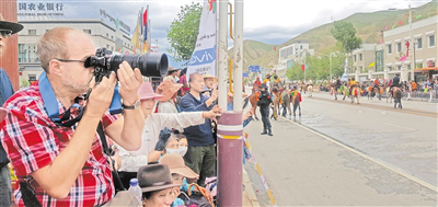 外國游客拍攝街頭巡游的馬術(shù)方隊(duì)