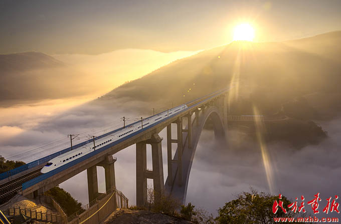 改革開放40年來,少數(shù)民族和民族地區(qū)成為改革開放的切實(shí)受益者,2017年1月1日,滬昆高鐵線上的列車沐浴著新年的陽光飛馳在云貴高原上(史家明 攝影)