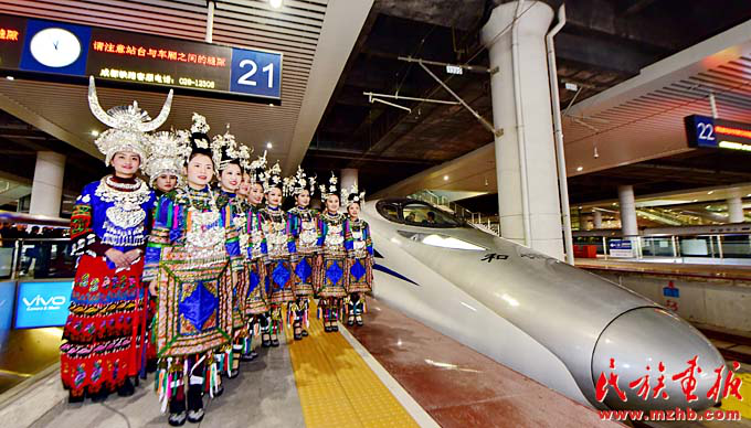 用少數(shù)民族禮儀歡送貴陽北站首開G4135次至昆明的高鐵(李勇 攝影)