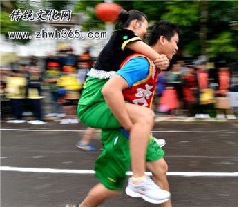 在昌江黎族自治縣一帶流行。每年的農歷十五前后,孩子們就聚居在一空曠地,舉行村與村之間比賽。可根據人數來分組,每組2人(一男一女),每次由兩組進行,實行淘汰制,男背著女或女背著男亦可,與對方互相碰撞,男女通過踢、拉、推等動作,千方百計地把對方背著的人或拉下,或把兩人分開,或倒地。在場觀看的人興高采烈,笑聲不斷,其樂無窮。