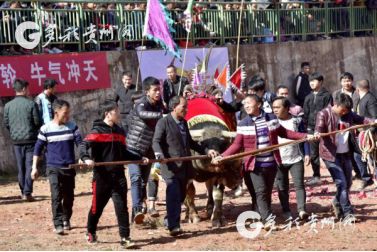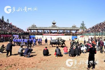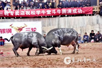 貴州省從江縣第十五屆原生態(tài)侗族大歌節(jié)的前一天,恰逢該縣逢亥斗牛日,丙妹鎮(zhèn)松學(xué)斗牛塘、谷坪鄉(xiāng)四寨河斗牛塘同時(shí)舉辦傳統(tǒng)牛王爭(zhēng)霸賽,喜迎一年一度“侗族大歌節(jié)”的到來(lái),共有來(lái)自周邊村寨的80頭水牯牛參戰(zhàn),斗?;顒?dòng)場(chǎng)上名牛角逐,場(chǎng)面異彩紛呈,吸引數(shù)萬(wàn)名觀眾前來(lái)觀戰(zhàn)。