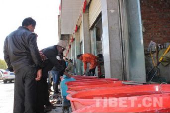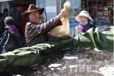 在當(dāng)?shù)厮幫跎睫r(nóng)貿(mào)市場可以看到,很多信眾或帶著器皿或拿著塑料口袋前往水產(chǎn)店買魚放生。甚至有的信眾開著一輛面包車,車廂用塑料包裹,里面裝滿水,載著買來的一整車魚前往拉薩河放生。 “薩嘎達(dá)瓦節(jié)期間,魚賣的特別快,藏歷十五的時(shí)候我們的魚都被買光了?!彼a(chǎn)市場的李老板說。
