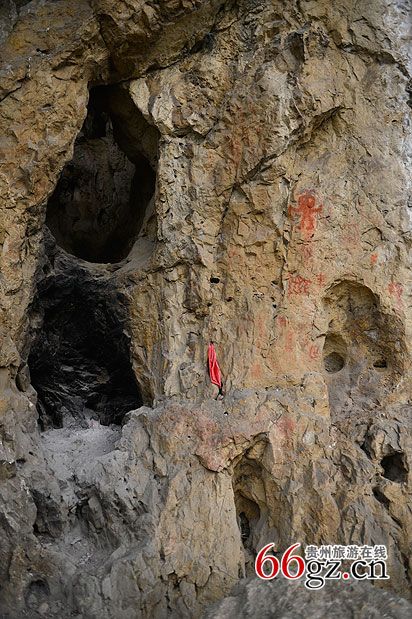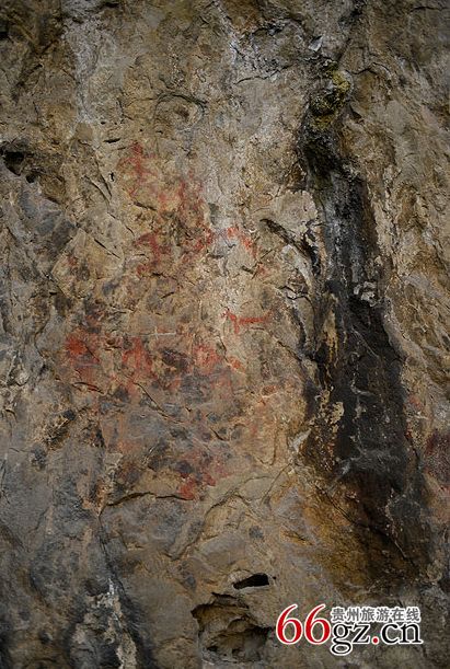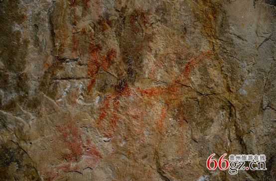 據(jù)資料載,金山洞古代崖畫以赭色涂繪人、馬、狗等等,隱約可見形態(tài)各異的大小圖像二三十個。人物多作行走狀,亦有雙手高舉者,似乎在祈禱。從其畫風(fēng)觀察,與相距不遠的省級文物保護單位--長順龍家院崖畫十分相似。