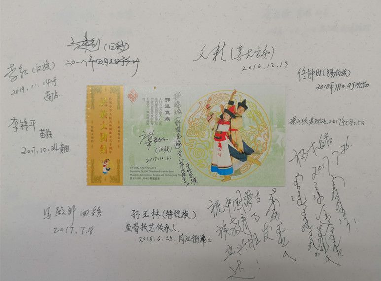 在采集口述影像錄音資料的同時,項目組還收集了大量的珍貴歷史照片以及相關(guān)文物。值得一提的是,他們設(shè)計了一種非常有特色的受訪者簽名簿,中間貼著繪有56個民族的音樂舞蹈圖案的首日封或明信片,四周簽上受訪者的人名簽名字、民族特征,有些還用民族文字書寫,體現(xiàn)了中華各民族團(tuán)結(jié)在一起的精神風(fēng)貌。簽名簿有厚厚的幾大本,設(shè)計精美,承載著民族工作口述史資源采集的經(jīng)歷,具有豐富的文化內(nèi)涵和博物館收藏價值。