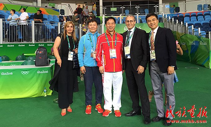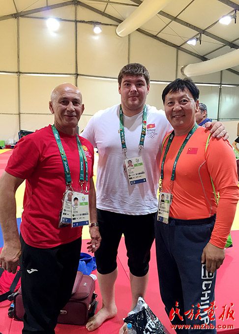 2016年,里約奧運會期間,烏日根桑格(左)與中國國家柔道隊隊員于頌(中)、國家柔道隊原主教練程志山合影留念。