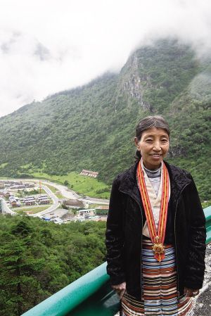 卓嘎在通向玉麥的盤山公路上留影。 新華社記者 孫瑞博攝