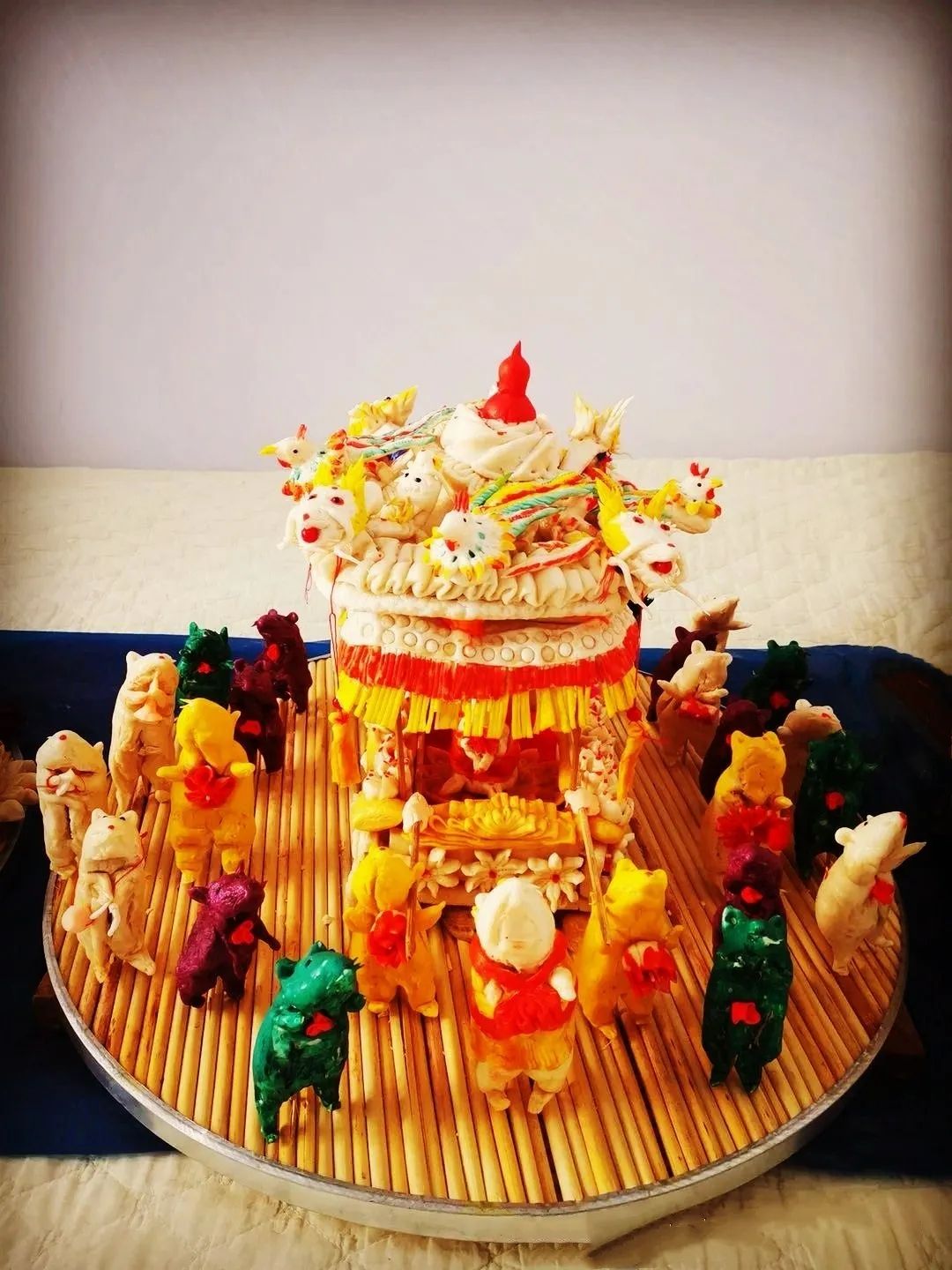 由于托克托縣地理位置獨特,早在清朝時期是塞外聞名的“水旱碼頭”,這里交通便利,經濟繁榮??涤呵瑫r期兩翼土地的放墾,成為口外漢族村落形成的主要原因。到乾嘉之際,土默川縱橫900余里田陌相望,農商兩業(yè)日臻繁盛。大批山西、陜西、河北等地農民、商人、小手工業(yè)者紛紛來到這里種田、經商及傳授手工技藝。從而晉陜地區(qū)的捏面人手工技藝也被帶到托克托縣地區(qū),在這里漢族和少數(shù)民族(主要是蒙古族)相互融合,形成了獨具特色的托克托縣面塑技藝。內蒙古自治區(qū)級非物質文化遺產代表性傳承人薛籽女,托克托縣章蓋營村人,是自治區(qū)級托克托縣面塑傳承人,下面展示的是她創(chuàng)作的面塑作品:《老鼠娶親》、《鼠年抗疫情》、《千手觀音》。