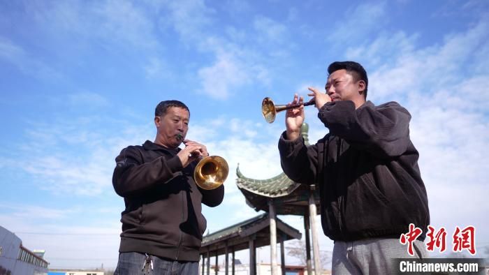李曉盼(右)在吹奏嗩吶。 吳瓊 攝