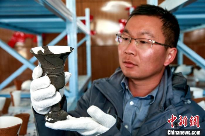 考古人員展示新發(fā)掘出土的“蛋殼陶杯” 楊東 攝