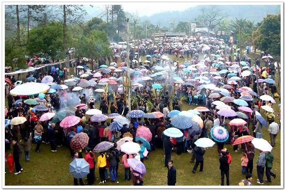 香粉古龍坡會于每年農(nóng)歷正月十六舉行,所以又名“十六”坡。這一天、來自外國朋友、各地的游客及當(dāng)?shù)胤綀A十里的苗哥苗妹,提蘆笙,提鳥籠、牽馬匹,打花傘……朝著十六坡趕來。正午時分,山梁上、村道間、河溪旁,出現(xiàn)了成列成隊穿紅戴綠的人群。遠(yuǎn)遠(yuǎn)望去,似一條彩帶在飄動。當(dāng)萬余人匯集后,整個坡地就成了彩色的世界。