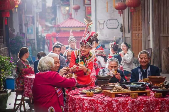 2.畬族婚嫁:婚禮的特色較多。迎親隊(duì)伍到村時(shí),嫁方村上女性拿杉木枝欄路,表示晚上要對歌;到中堂時(shí),嫁方請四位男子與迎親隊(duì)伍中四人相對作揖,此儀式叫“拾田螺”,表示歡迎;中餐由嫁方請迎親隊(duì)伍,媒人就坐中堂席首位,叫“落腳酒”;晚餐由娶方請嫁方親戚朋友,舅公就坐首席,叫請“大酒”;午后,赤郎舉行“借鍋”儀式,赤郎端點(diǎn)紅燭放有一刀肉和兩塊豆腐的米篩向灶神作揖后,用謎語念借所有的炊具,姑嫂們把能藏的炊具都藏起來,念不到就不拿出來,要全部重借,“借鍋”意為娶方借嫁方炊具宴請客人。借好之后,赤郎要?dú)⑷⒎郊姨魜淼囊恢还u用以嫁方“請祖公”,殺雞時(shí),規(guī)定血不許滴到地上,滴一滴地上罰一碗酒;宴席中途嫁方女歌手會起歌頭找赤郎對歌。畬族婚禮的又一個特點(diǎn)是,新娘夜行嫁,卯時(shí)進(jìn)夫家門。行嫁時(shí)有牛在前頭踏路,意為新娘一切都要新的,牛踏過的路為新路。以往嫁妝有鋤頭、斗笠、棕衣、線簍、火籠等,體現(xiàn)了畬族婦女熱愛勞動。