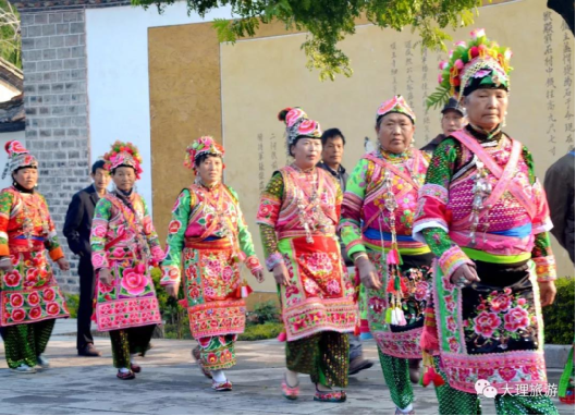 男子頭頂氈帽(又稱(chēng)氈窩),穿大襟衣、大襠褲,赤足或穿草鞋,披羊皮,外出背皮袋(現(xiàn)已基本消失)。女子裹高包頭、額上飾銀桂花,衣為布襟,外套坎肩,腰系大圍腰,大圍腰左右下三邊繡五色花,為動(dòng)植物圖案,足穿繡花鳳頭鞋,用本地產(chǎn)綠布條制褲子,不鎖腳邊,腰間背圓形白氈裹背,所穿服飾顏色鮮艷、質(zhì)地厚重,盡顯遠(yuǎn)古南詔皇室服飾遺風(fēng)。
