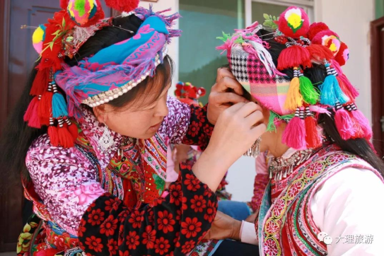 踏歌會(huì)上,來(lái)自彌渡彝族聚居地的各村各寨男女老幼穿戴整齊,云集在鐵柱廟,這里便形成了五彩斑斕的彝族服飾比賽場(chǎng),每位彝族婦女的頭飾就是她心靈手巧的見(jiàn)證。