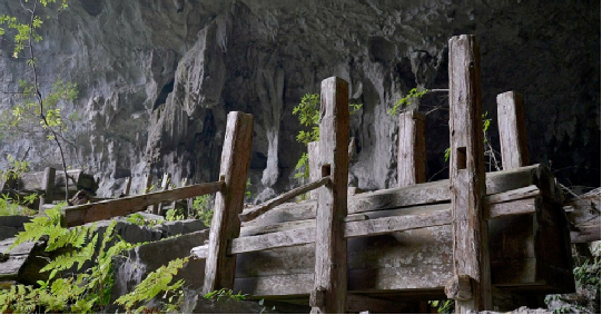 果里巖洞葬位于貴州龍里縣擺省鄉(xiāng)果里村東1公里煤洞坡的洞穴中,地處巖溶山原,峰叢林立,喬灌間雜。該洞在山頂下四十米處呈南北向橫穿山體,長580米,寬為38—65米,高為21—50米,有兩個入口;北面入口,寬54米,高21米,;南面入口,寬35米,高45米,有三道石砌墻垣。洞中地勢內(nèi)斜平緩,洞內(nèi)干燥,能見度好,入口處地勢外斜。據(jù)查,果里的苗族于明朝初期從貴陽遷徙而來。從遷徙之初至清末,他們均習慣將亡者殮于棺木集中存放在洞穴之內(nèi)。在洞穴北面入口3000平方米的范圍內(nèi)現(xiàn)存完好的棺木有192具,腐朽散落及其它原因損毀的約200余具。棺木材質(zhì)為杉木。棺木有平板平頭和鼓型雄頭之分,其大小因亡者的體型而定。平板平頭型棺木制作粗糙,長1.45—2.23米,寬0.46—0.75米,高0.46——0.9米;鼓型雄頭棺木多為杉木本色,長1.5—2.23米,寬0.48—0.8米,高0.5—0.9米。棺木一律頭向北面入口,均固定于兩個或三個“井”字架上;三個“井”字架表明亡者為男性,兩個“井”字架的為女性。棺內(nèi)亡者頭靠凹型木枕。平板平頭棺為明代,鼓型雄頭棺為清代。
