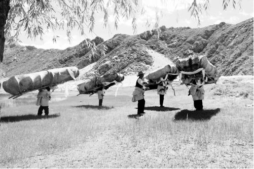 據(jù)當(dāng)?shù)厝私榻B,牛皮船構(gòu)造簡單,用木頭做船架、牛皮做船體。首先采用比較堅硬有彈性的樹木來做骨架,然后把牦牛皮泡在水里,將皮上的毛和肉全部去掉后,用四張牛皮并對縫起來,趁牛皮軟時包在骨架上,同時用牛皮繩子捆緊繃好、曬干、擦油定型,再在牛皮接頭處采用牛、羊油來堵住縫口密封好,避免進水。