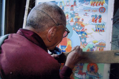 嘎瑪噶赤畫派,屬西藏東部地區(qū)畫派。相傳由郎卡扎西所創(chuàng),與其同時(shí)期的八世噶瑪巴米久多吉,奠定了嘎瑪噶赤畫派的理論基礎(chǔ)。十六世紀(jì),嘎瑪噶赤畫派開始盛行康區(qū),先后涌現(xiàn)出了一批大師。嘎瑪噶赤畫派在發(fā)展過程中,由于生存地域與漢地緊密相連,在政治、經(jīng)濟(jì)、文化上的交往也相對(duì)頻繁,尤其在繪畫方面,多受漢地明代以后工筆重彩畫和四川綿竹木版年畫的影響。嘎瑪噶赤畫派在嚴(yán)格繼承傳統(tǒng)繪畫的基礎(chǔ)上大膽創(chuàng)新,吸收漢族畫家工筆重彩之精華,注重抒情寫意之風(fēng)格;講究色彩對(duì)比,結(jié)構(gòu)嚴(yán)謹(jǐn),畫工細(xì)膩,最后達(dá)到精美絕倫之境界。其總體風(fēng)格形成了有別于衛(wèi)藏地區(qū)門唐、欽澤兩大畫派的特征。二十世紀(jì)初,噶瑪噶赤畫派藝術(shù)更為完善和成熟。