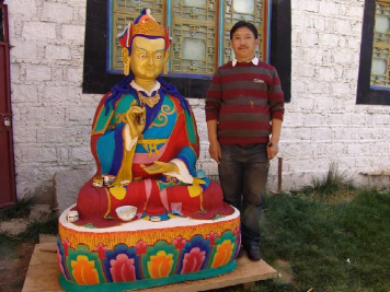 在泥塑技藝中除了面具外,佛像也是不計(jì)其數(shù),從形態(tài)上可分為喜相、怒相兩大類。“手工藝人在制作泥塑佛像時(shí)一定要按照標(biāo)準(zhǔn)進(jìn)行,就像畫(huà)唐卡一樣,這些藝人要把《造像度量經(jīng)》牢記在心里,在制作時(shí)要不停默背佛像的尺寸大小,所以你看這些已經(jīng)制作好的泥塑佛像在輪廓上都是固定的,只是在一些裝飾品上有所不同?!逼詹即稳室贿呏钢砼缘哪嗨芊鹣褚贿呏v解道。