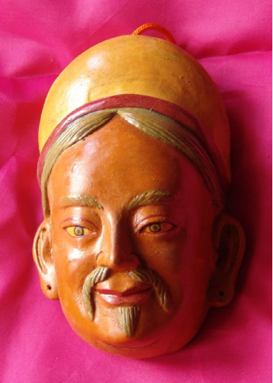 泥塑面具的制作也很有講究:“首先要將面具模型徹底風(fēng)干,然后在表面敷上摻有液體樹(shù)膠和面粉熬制而成的糨糊,再用一小塊布將風(fēng)干好的模子包好裹嚴(yán),接著要敷一層柴薪混合物,同樣用另一塊布把泥模包實(shí),反復(fù)四五次后,將模子放好讓它自然干透。這些步驟做完后,要用一根棍子敲打出包在里面的泥模,這樣就形成了布、樹(shù)、膠和面粉做成的一種面具。當(dāng)然,做好后還要進(jìn)行彩繪、涂清漆,這樣才能讓一個(gè)面具光彩奪目?!边叞驼f(shuō)道。