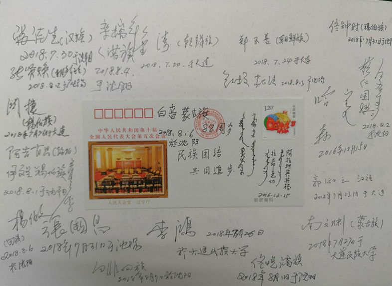 在采集口述影像錄音資料的同時,項目組還收集了大量的珍貴歷史照片以及相關(guān)文物。值得一提的是,他們設(shè)計了一種非常有特色的受訪者簽名簿,中間貼著繪有56個民族的音樂舞蹈圖案的首日封或明信片,四周簽上受訪者的人名簽名字、民族特征,有些還用民族文字書寫,體現(xiàn)了中華各民族團結(jié)在一起的精神風(fēng)貌。簽名簿有厚厚的幾大本,設(shè)計精美,承載著民族工作口述史資源采集的經(jīng)歷,具有豐富的文化內(nèi)涵和博物館收藏價值。