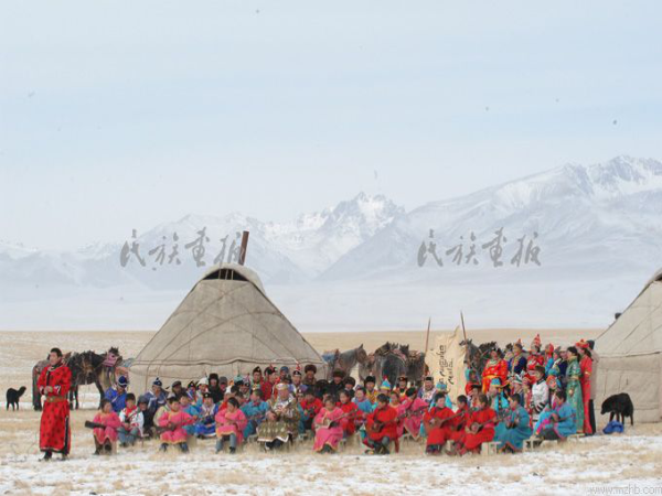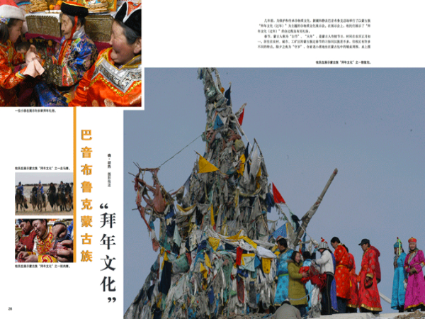 幾年前,為保護(hù)和傳承非物質(zhì)文化,新疆和靜縣巴音布魯克總場(chǎng)舉行了以蒙古族“拜年文化(過(guò)年)”為主題的非物質(zhì)文化展示會(huì)。在展示會(huì)上,牧民們展示了“拜年文化(過(guò)年)”的全過(guò)程及有關(guān)禮俗。